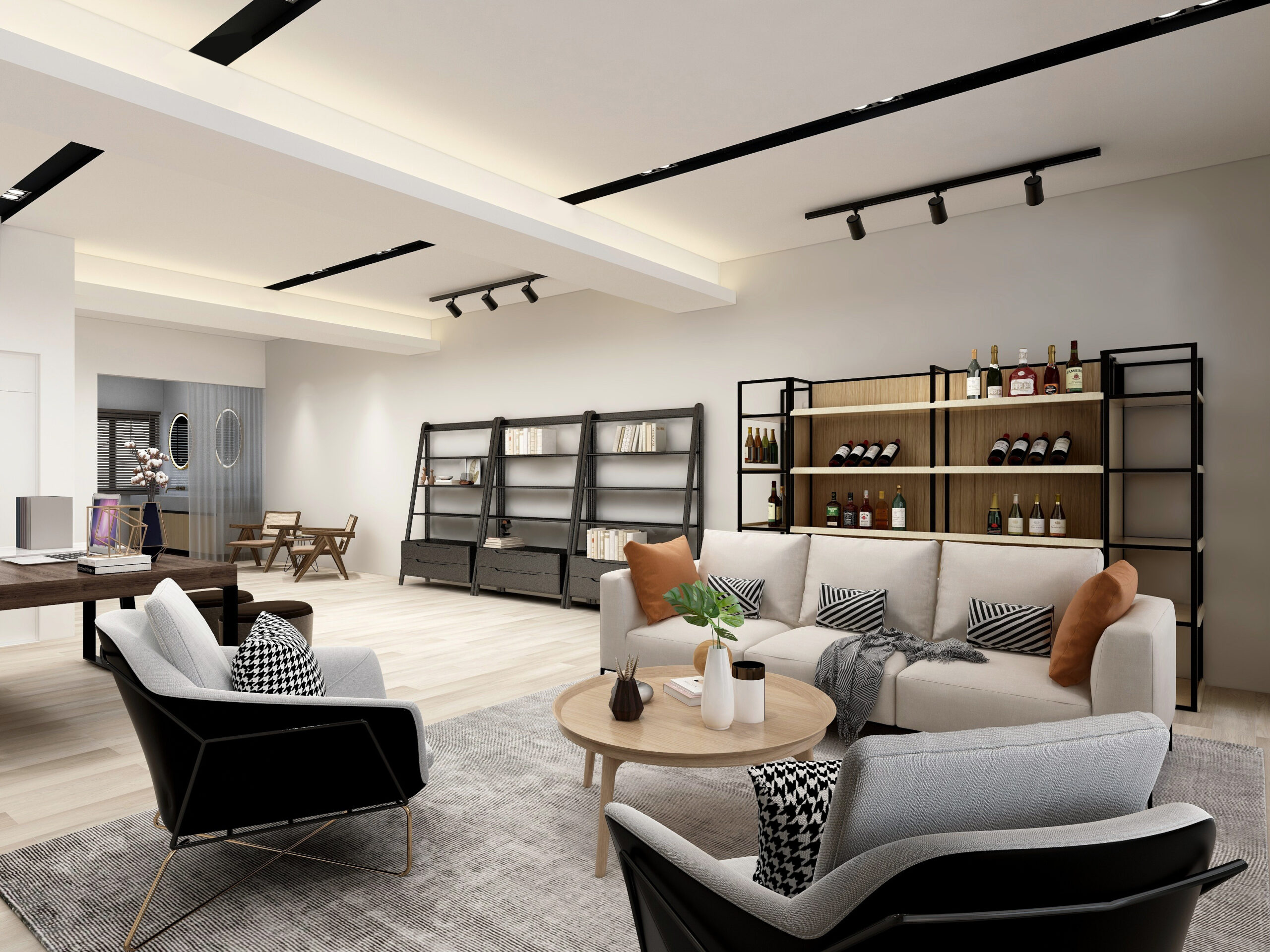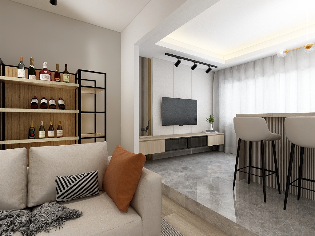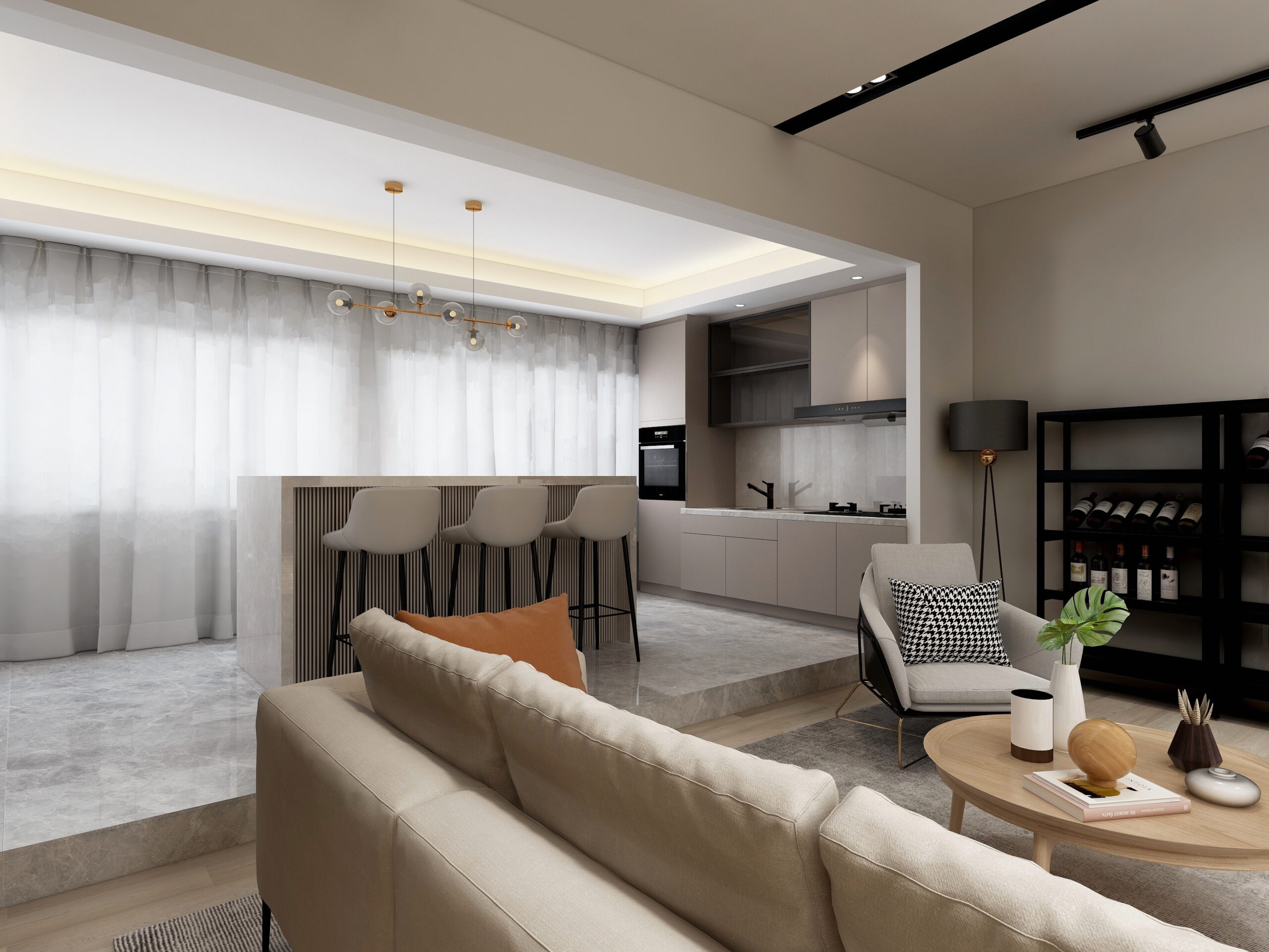 The Modern Contemporary spaces have an open-space concept, with the kitchen merging with the dining or living room, or both dining and living room merging with each other. This results in an airy and comfortable living space, avoiding ornate designs.